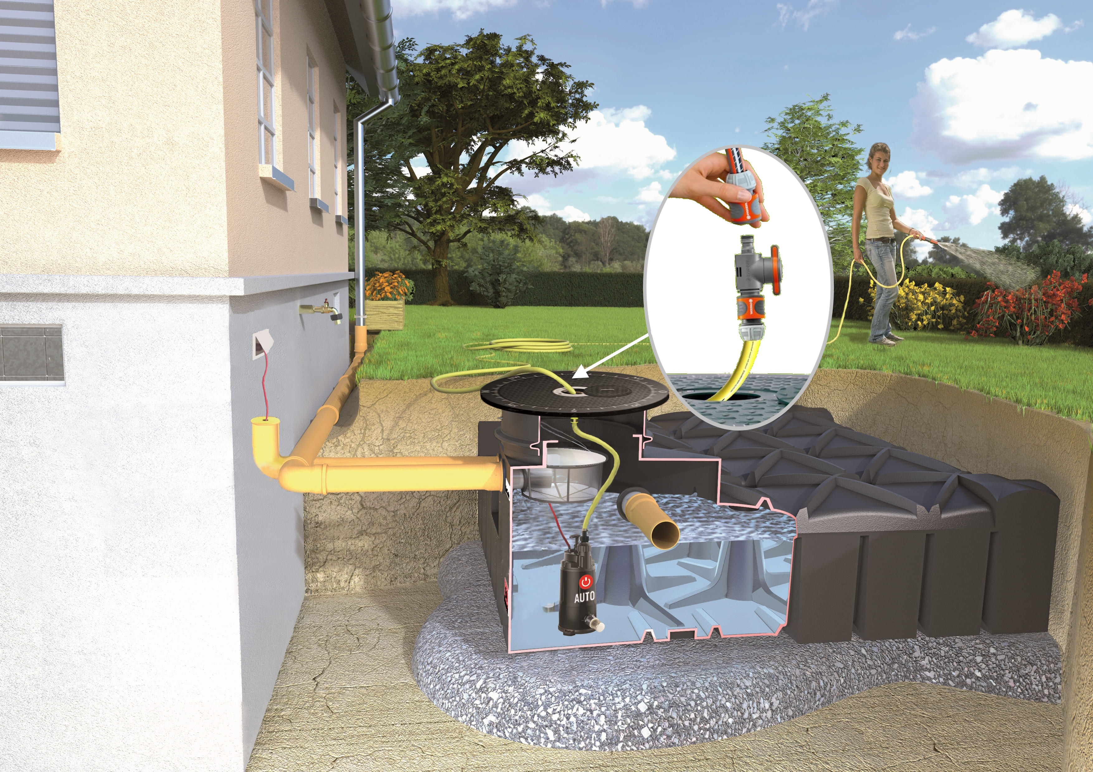 Nein! Es kann auch eine externe Entnahmestelle installiert werden. Diese können Sie mit handelsüblichen Produkten selbst gestalten oder Sie wählen z.B. unseren Wasserverteiler Rainstar oder unsere Zapfsäule Stelia. Der Tank hat neben dem Anschluss für Zu- und Überlauf einen Anschluss für das sogenannte Versorgungsrohr, durch das z.B. Stromkabel und auch Wasserleitungen sicher im Leerrohr verlegt werden können.